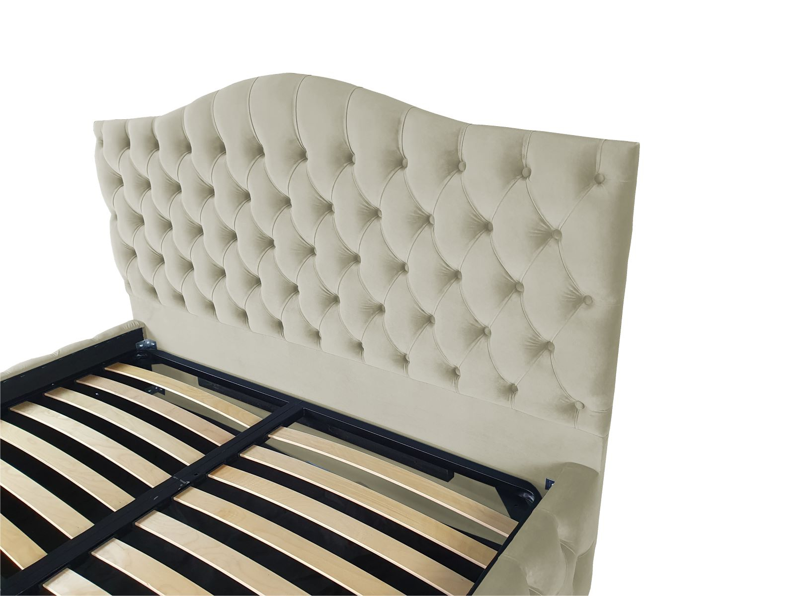 Veti fi captivat de aspectul sau unic și elegant. Rama patului este acoperita cu o tesatura moale catifelata. Un model de pat in stilul Chesterfield, tapitat in catifele moi si culori vibrante, perfect pentru un dormitor elegant. Este livrat cu somiera rabatabila cu spatiu pentru depozitare sub saltea.