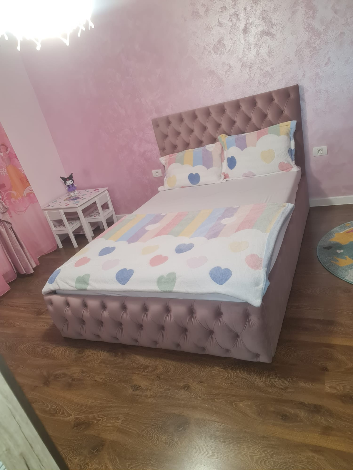 Pat tapitat Kirra -Produs in Romania. Veti fi captivat de aspectul sau unic și elegant. Rama patului este acoperita cu o tesatura moale catifelata. Un model de pat in stilul Chesterfield, tapitat in catifele moi si culori vibrante, perfect pentru un dormitor elegant. Ideal pentru saltele de 180x200 cm (saltea neinclusa). Este livrat cu somiera rabatabila cu spatiu pentru depozitare sub saltea.Se poate executa si pe alte culori.