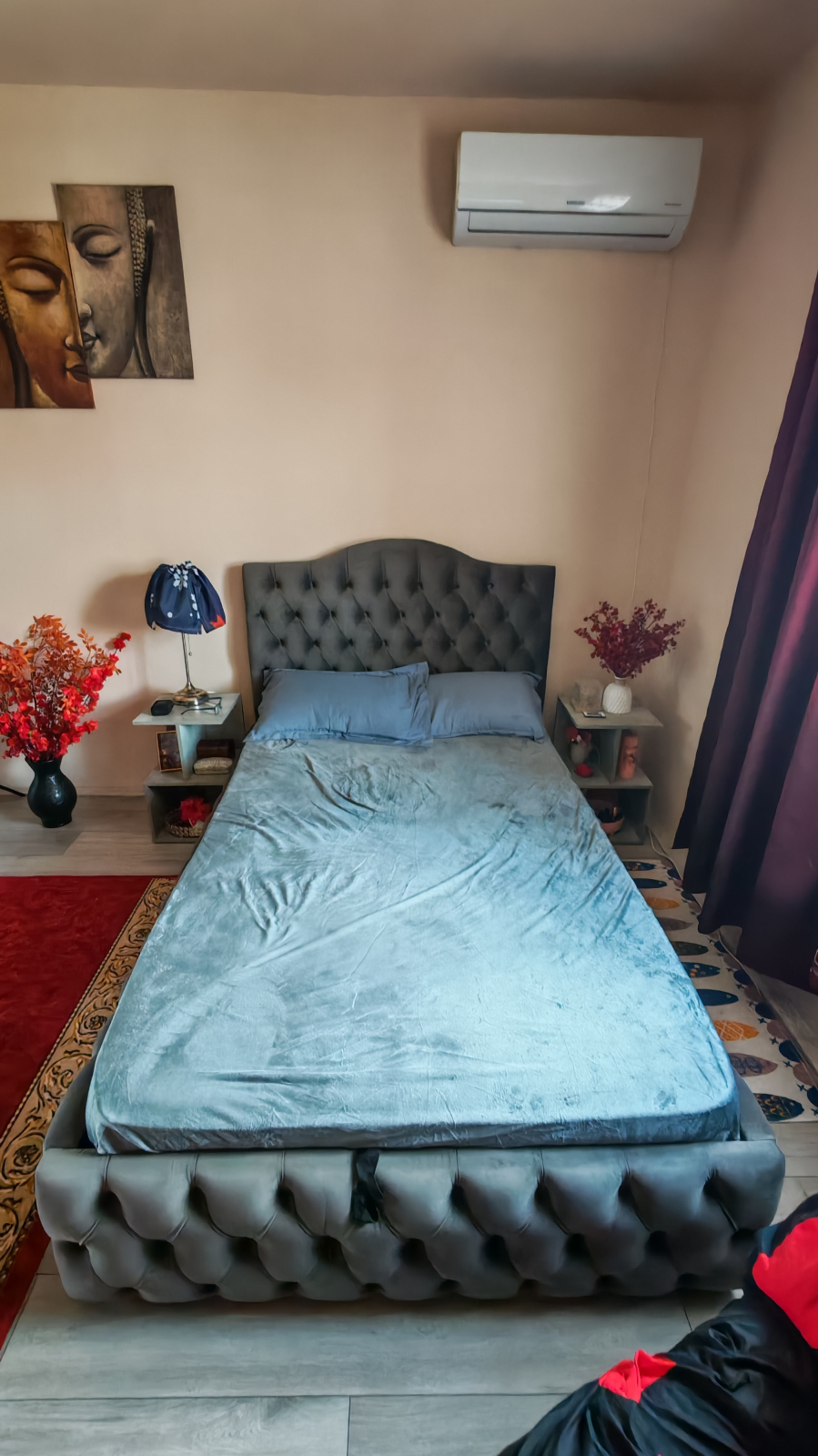 Veti fi captivat de aspectul sau unic și elegant. Rama patului este acoperita cu o tesatura moale catifelata. Un model de pat in stilul Chesterfield, tapitat in catifele moi si culori vibrante, perfect pentru un dormitor elegant. Este livrat cu somiera rabatabila cu spatiu pentru depozitare sub saltea.