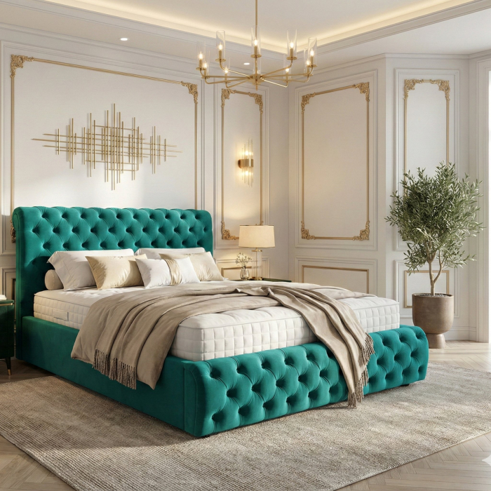 Veti fi captivat de aspectul sau unic și elegant. Rama patului este acoperita cu o tesatura moale catifelata. Un model de pat in stilul Chesterfield, tapitat in catifele moi si culori vibrante, perfect pentru un dormitor elegant. Este livrat cu somiera rabatabila cu spatiu pentru depozitare sub saltea.
