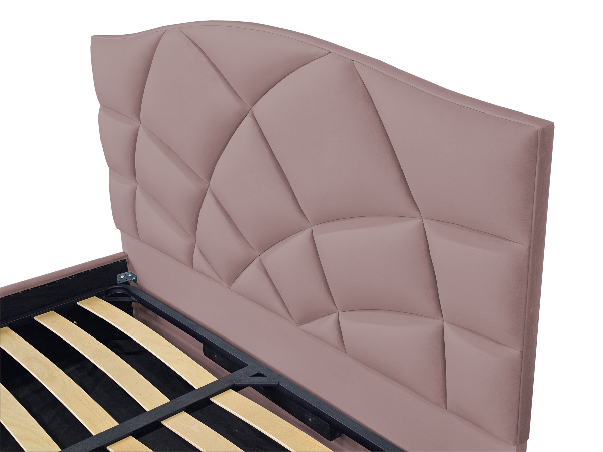 Patul tapitat Venus  adaugă o notă de căldură și eleganțăt .Materialul tapițeriei este  din catifea, plăcut la atingere.Acest pat este potrivit pentru un dormitor elegant și confortabil.Detaliile geometrice ale panourilor sunt subtile, dar adaugă un aspect sofisticat.Capul de pat este înalt și curbat, cu o formă care amintește de o arcadă.Este prevazut cu somiera rabatabila si spatiu pentru depozitare.