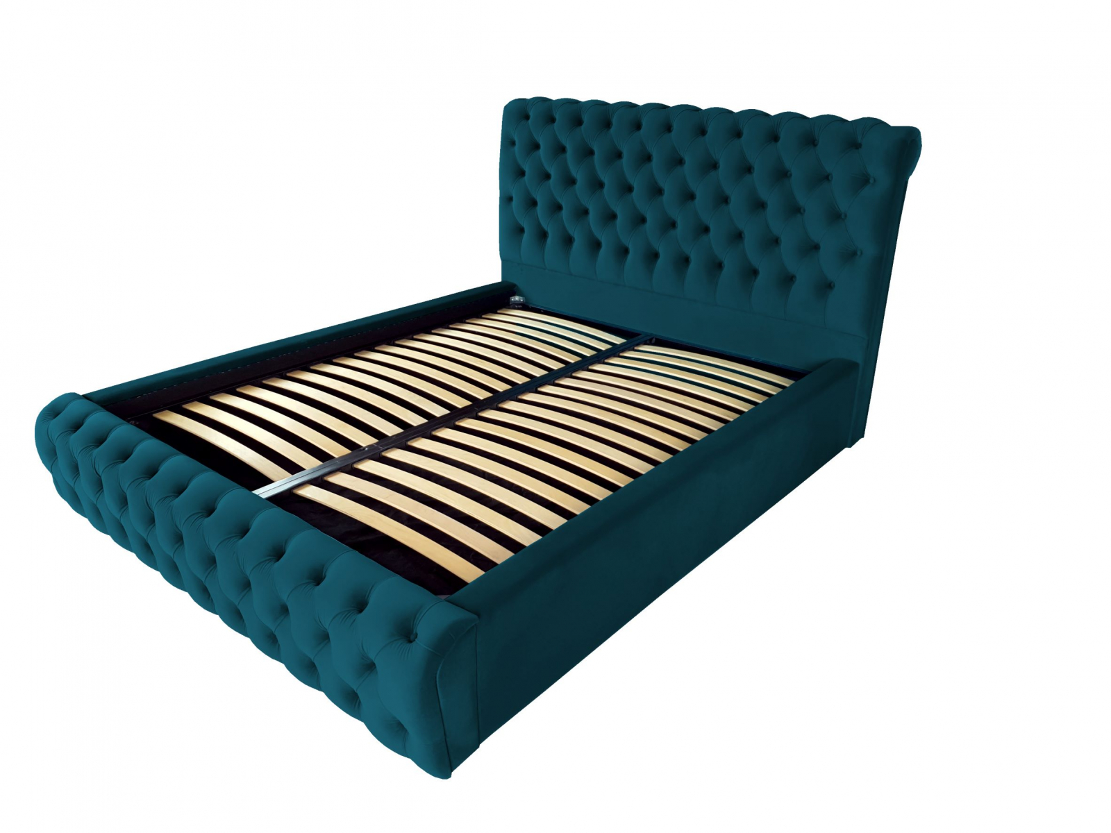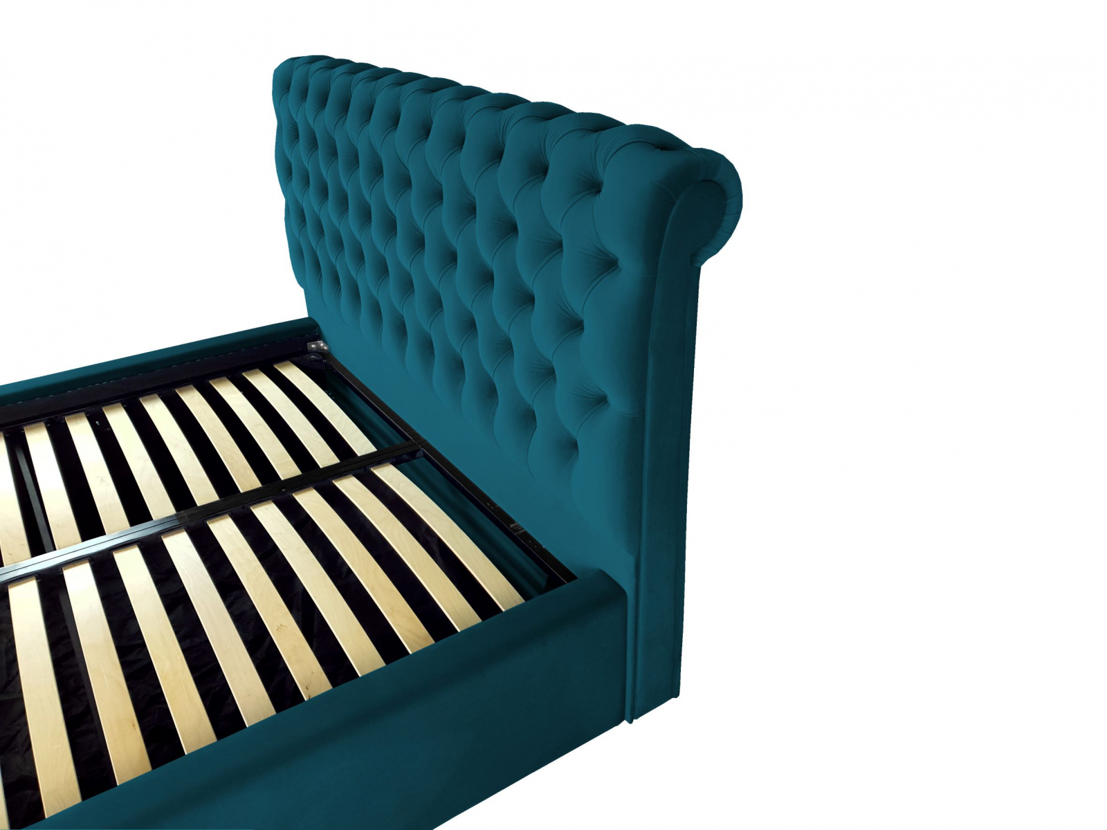 Veti fi captivat de aspectul sau unic și elegant. Rama patului este acoperita cu o tesatura moale catifelata. Un model de pat in stilul Chesterfield, tapitat in catifele moi si culori vibrante, perfect pentru un dormitor elegant.  Este livrat cu somiera rabatabila cu spatiu pentru depozitare sub saltea.