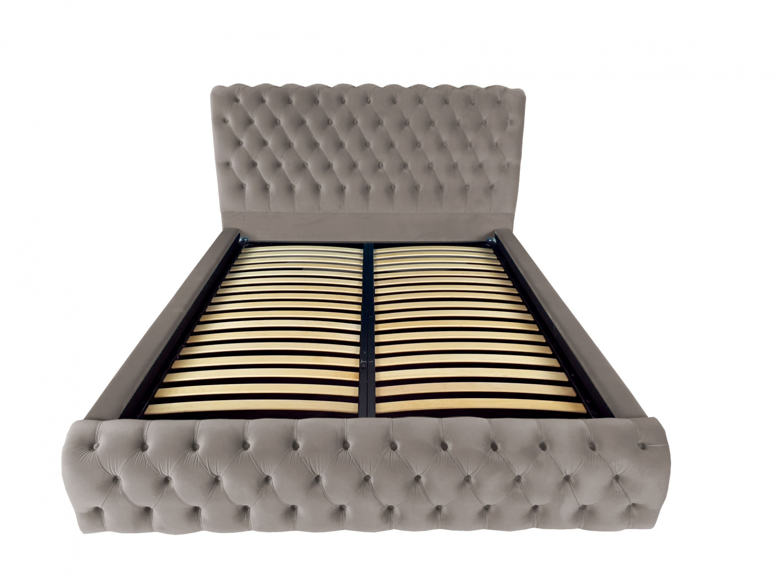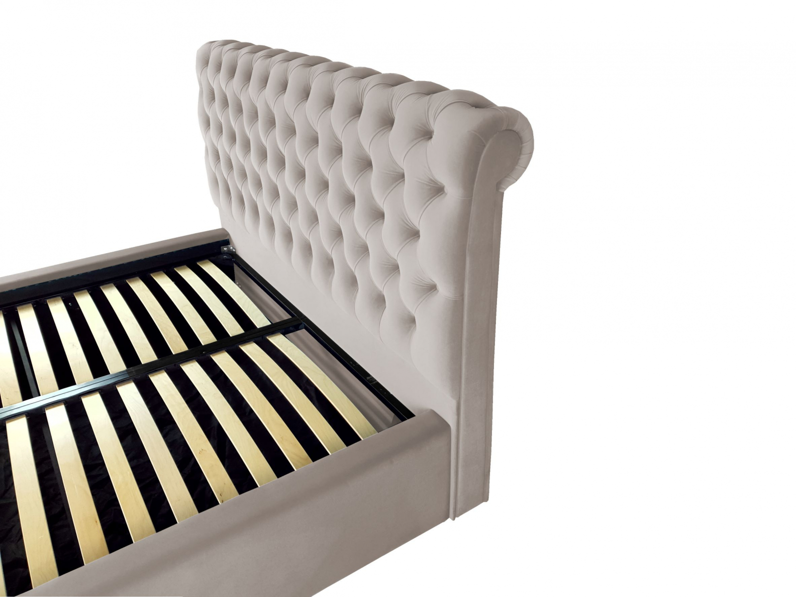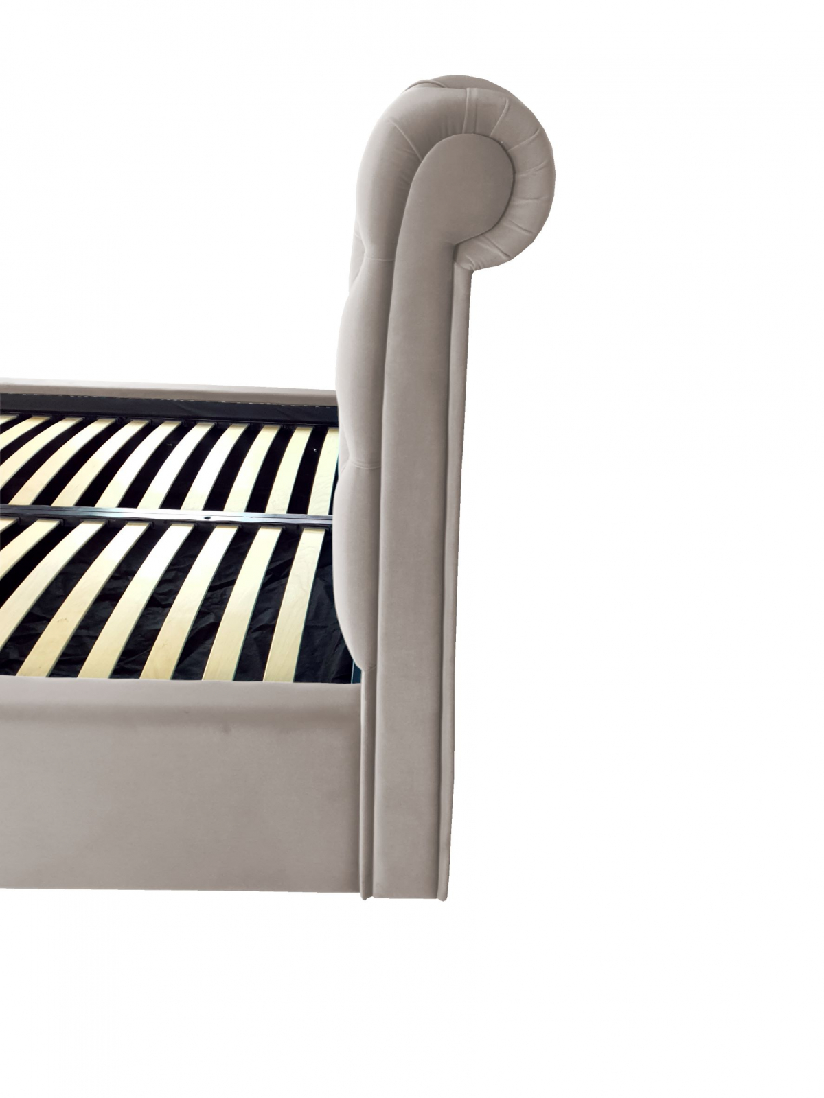 Veti fi captivat de aspectul sau unic și elegant. Rama patului este acoperita cu o tesatura moale catifelata. Un model de pat in stilul Chesterfield, tapitat in catifele moi si culori vibrante, perfect pentru un dormitor elegant.  Este livrat cu somiera rabatabila cu spatiu pentru depozitare sub saltea.