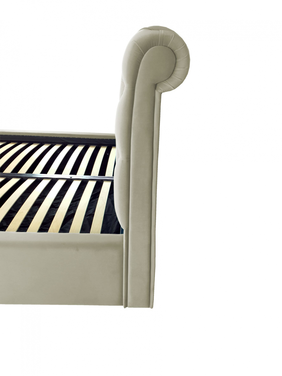 Veti fi captivat de aspectul sau unic și elegant. Rama patului este acoperita cu o tesatura moale catifelata. Un model de pat in stilul Chesterfield, tapitat in catifele moi si culori vibrante, perfect pentru un dormitor elegant.  Este livrat cu somiera rabatabila cu spatiu pentru depozitare sub saltea.