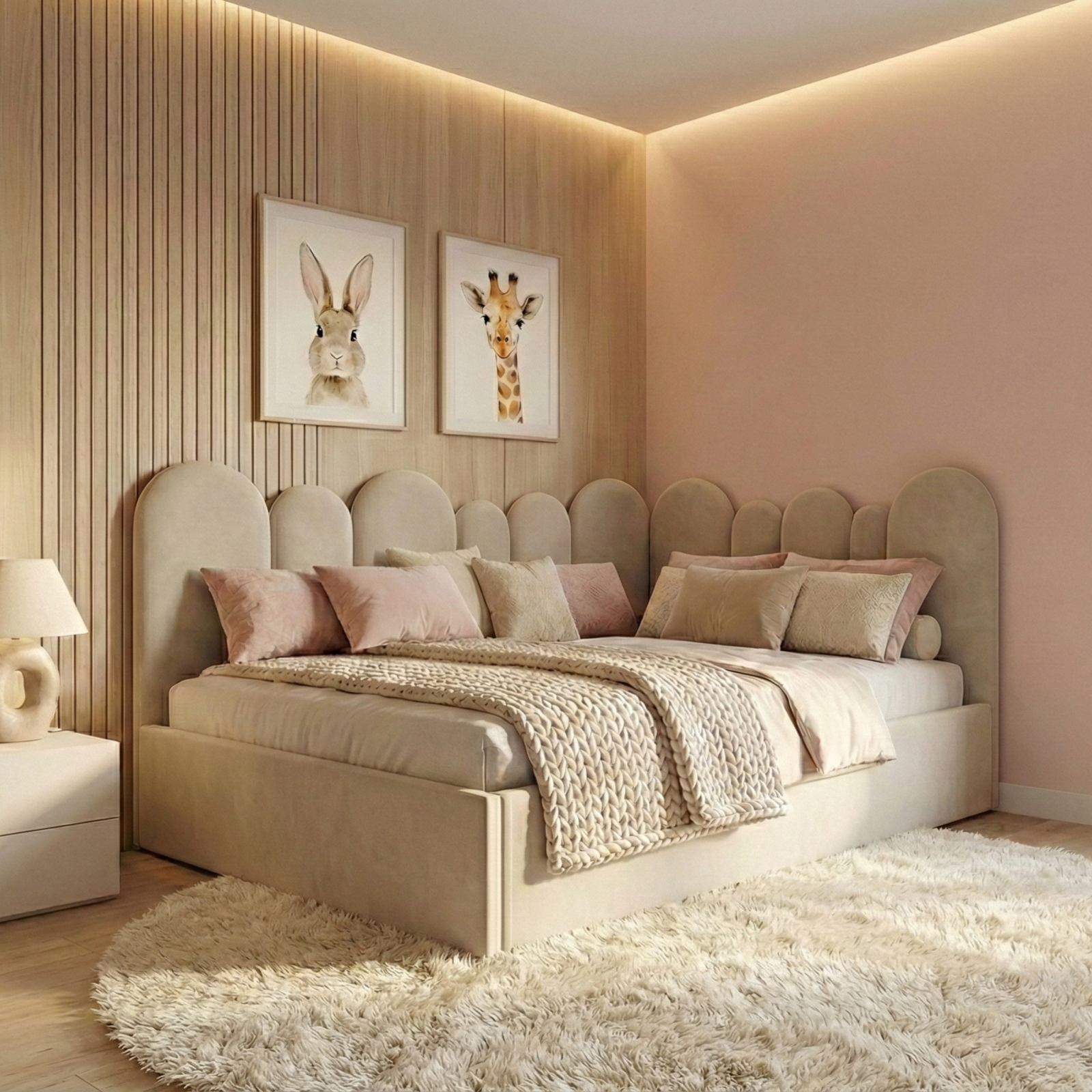 Patul pentru copii KAYA este un pat tapițat premium, conceput pentru confort, siguranță și design elegant. Formele rotunjite și tăblia moale îl fac ideal pentru camera copiilor, fete sau băieți.