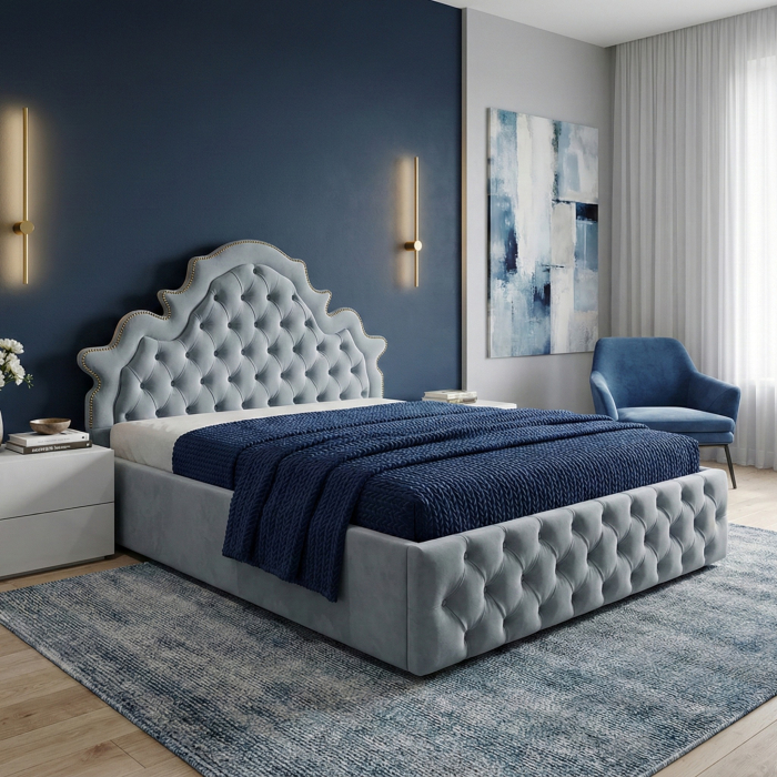 Patul Elise are un aspect  elegant și clasic.  Designul patului indică un stil contemporan cu influențe clasice, sugerând un grad de confort și lux, potrivindu-se bine într-un decor de dormitor modern sau tradițional.Capul patului are un design capitonat, cu un contur clasic și elegant, în stilul cambré, accentuat cu nasturi si cuie decorativ.