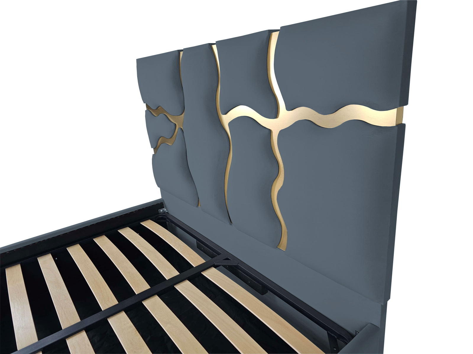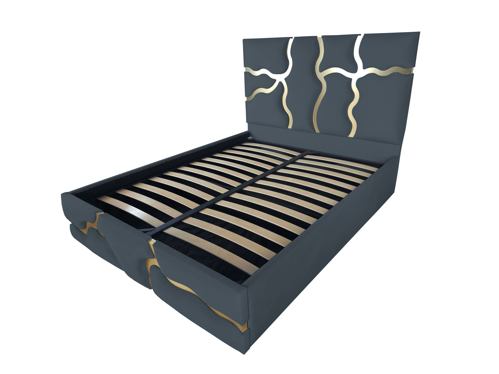 Patul Etna  este un pat tapitat ce incearca sa imite  urmele de lavă de culoare aurie. Este  o declarație de stil îndrăzneață și o piesă de mobilier care cu siguranță atrage atenția în orice cameră. Este o combinație de confort, funcționalitate și design artistic, care aduce un strop de aventură și mister în decorul casei dumneavoastră.Elementele  de culoare aurie sunt strălucitoare si  imită modul în care lava incandescentă strălucește în lumina soarelui.