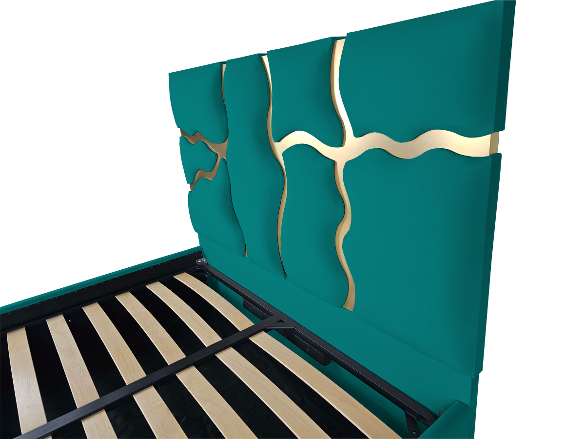 Patul Etna  este un pat tapitat ce incearca sa imite  urmele de lavă de culoare aurie. Este  o declarație de stil îndrăzneață și o piesă de mobilier care cu siguranță atrage atenția în orice cameră. Este o combinație de confort, funcționalitate și design artistic, care aduce un strop de aventură și mister în decorul casei dumneavoastră.Elementele  de culoare aurie sunt strălucitoare si  imită modul în care lava incandescentă strălucește în lumina soarelui.