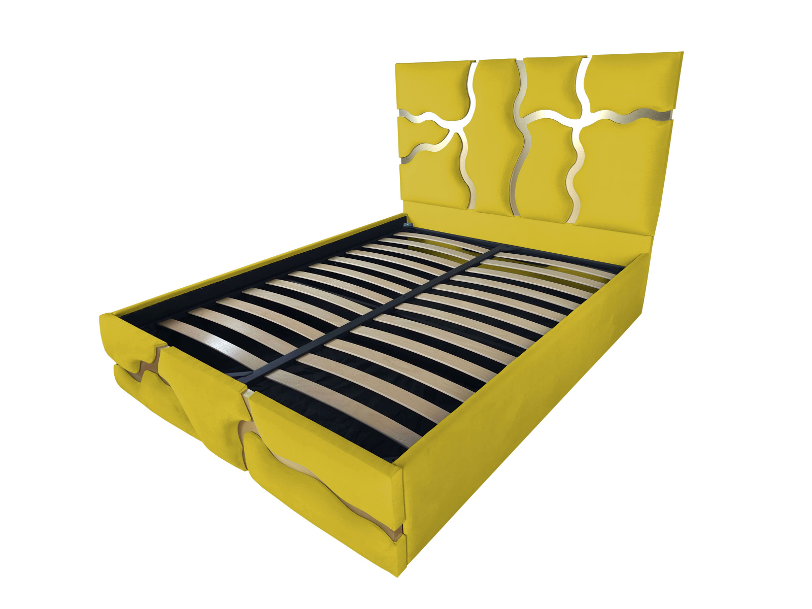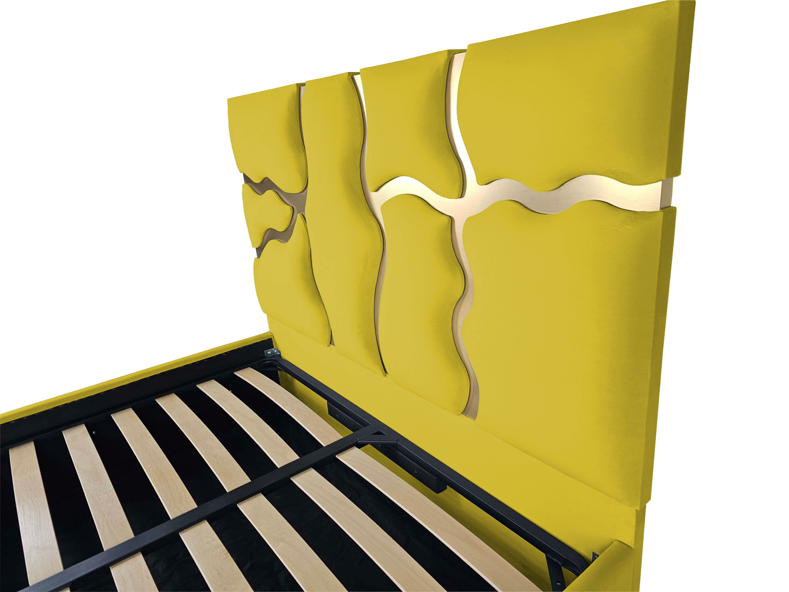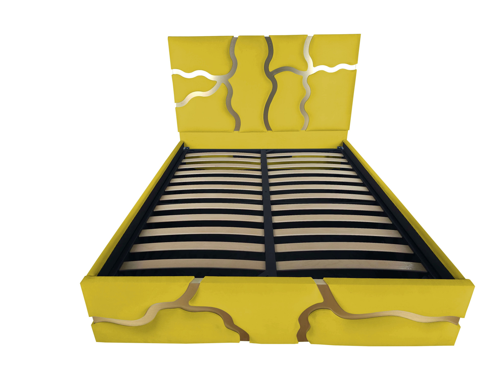 Patul Etna  este un pat tapitat ce incearca sa imite  urmele de lavă de culoare aurie. Este  o declarație de stil îndrăzneață și o piesă de mobilier care cu siguranță atrage atenția în orice cameră. Este o combinație de confort, funcționalitate și design artistic, care aduce un strop de aventură și mister în decorul casei dumneavoastră.Elementele  de culoare aurie sunt strălucitoare si  imită modul în care lava incandescentă strălucește în lumina soarelui.