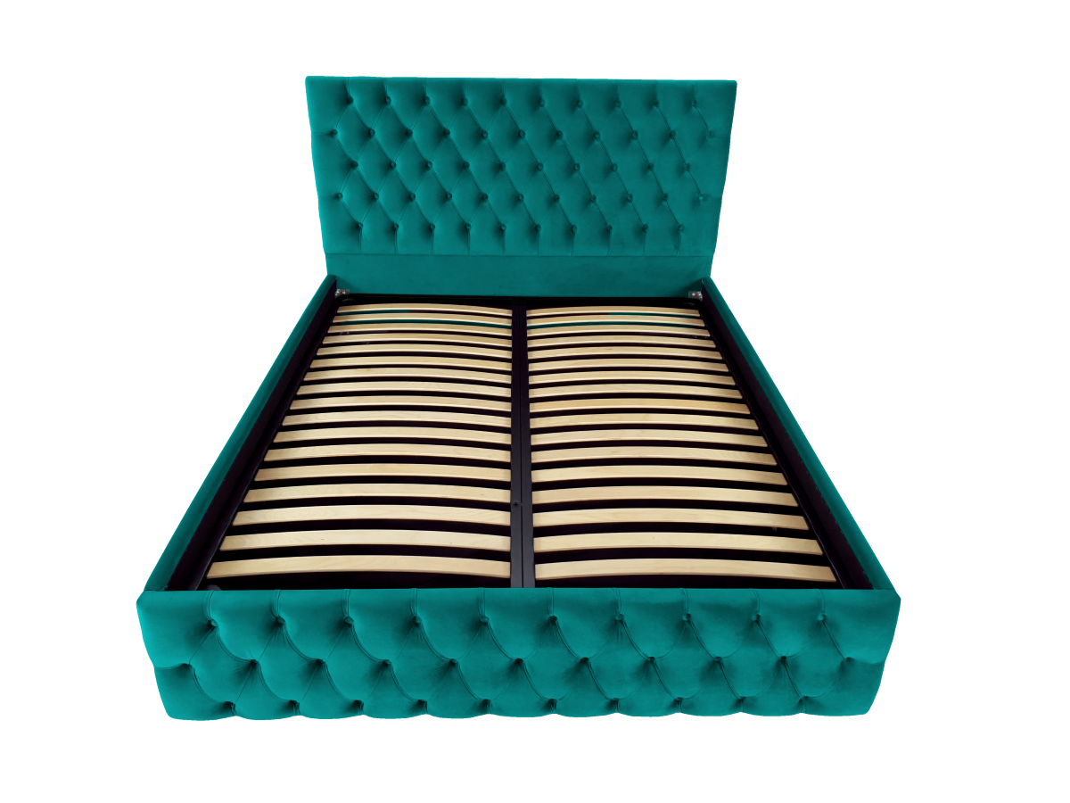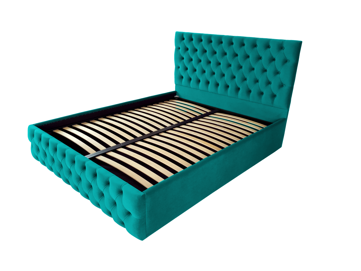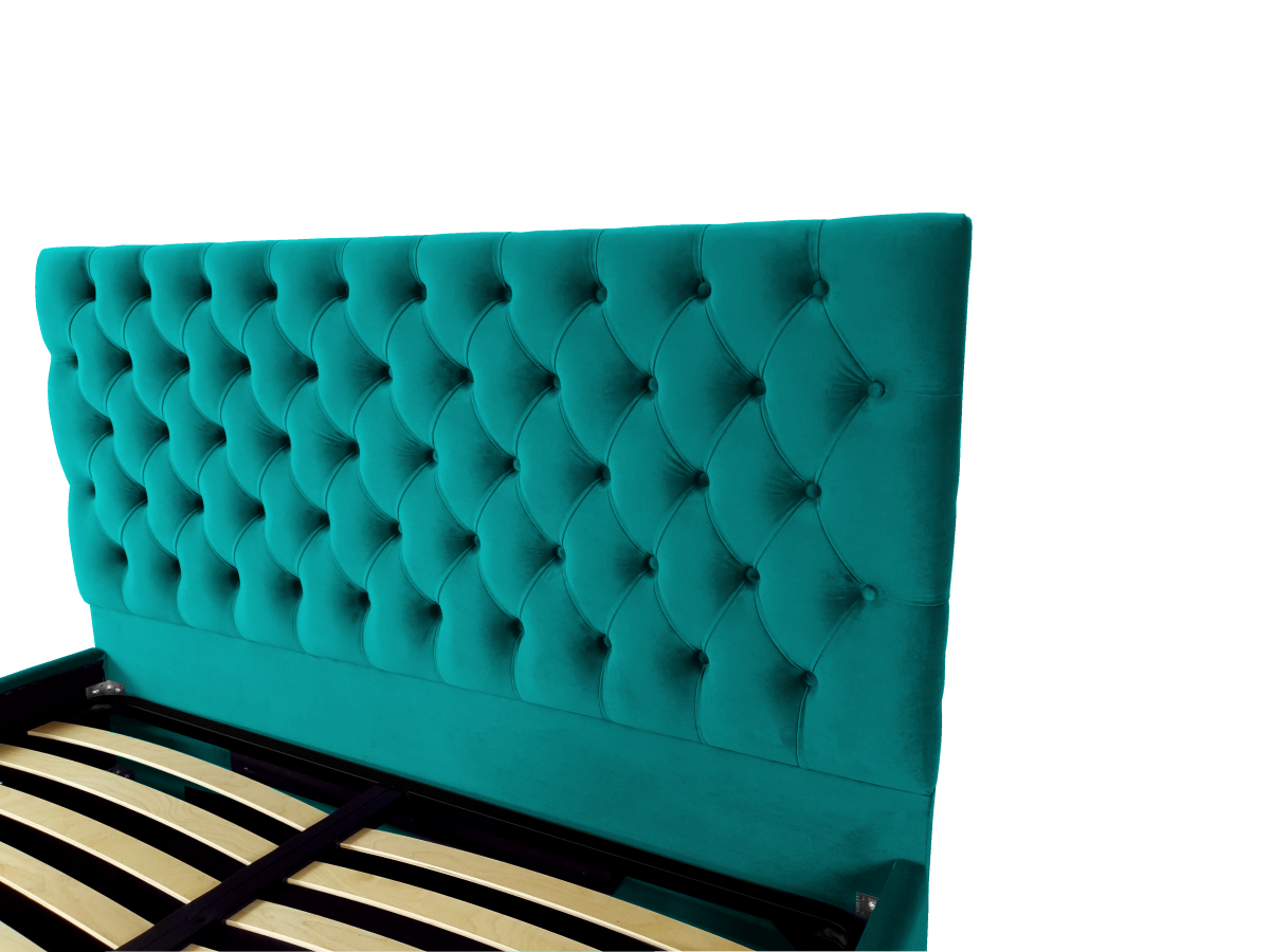 Pat tapitat Kirra -Produs in Romania. Veti fi captivat de aspectul sau unic și elegant. Rama patului este acoperita cu o tesatura moale catifelata. Un model de pat in stilul Chesterfield, tapitat in catifele moi si culori vibrante, perfect pentru un dormitor elegant. Ideal pentru saltele de 180x200 cm (saltea neinclusa). Este livrat cu somiera rabatabila cu spatiu pentru depozitare sub saltea.Se poate executa si pe alte culori.