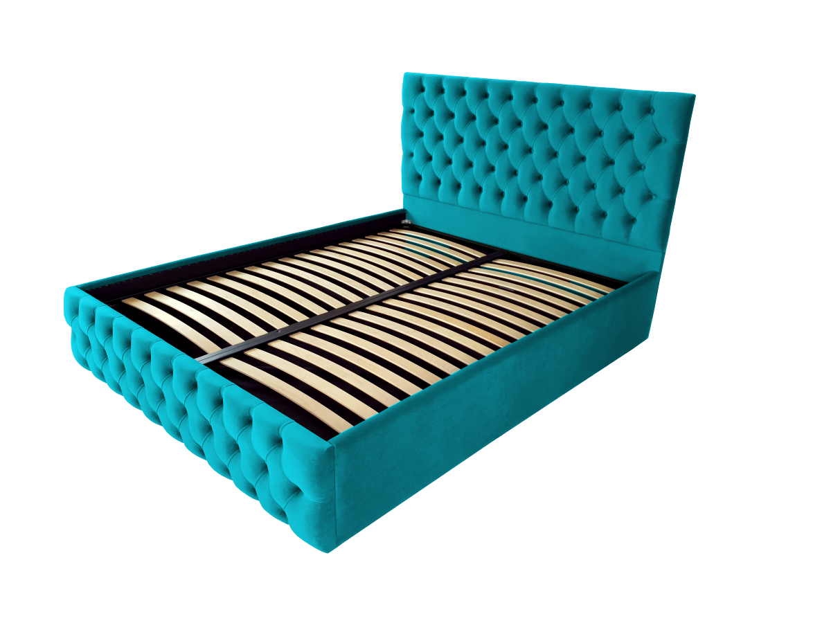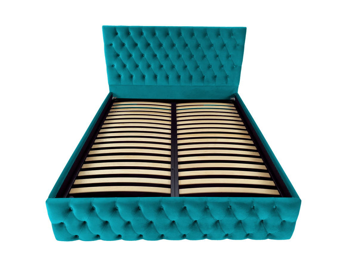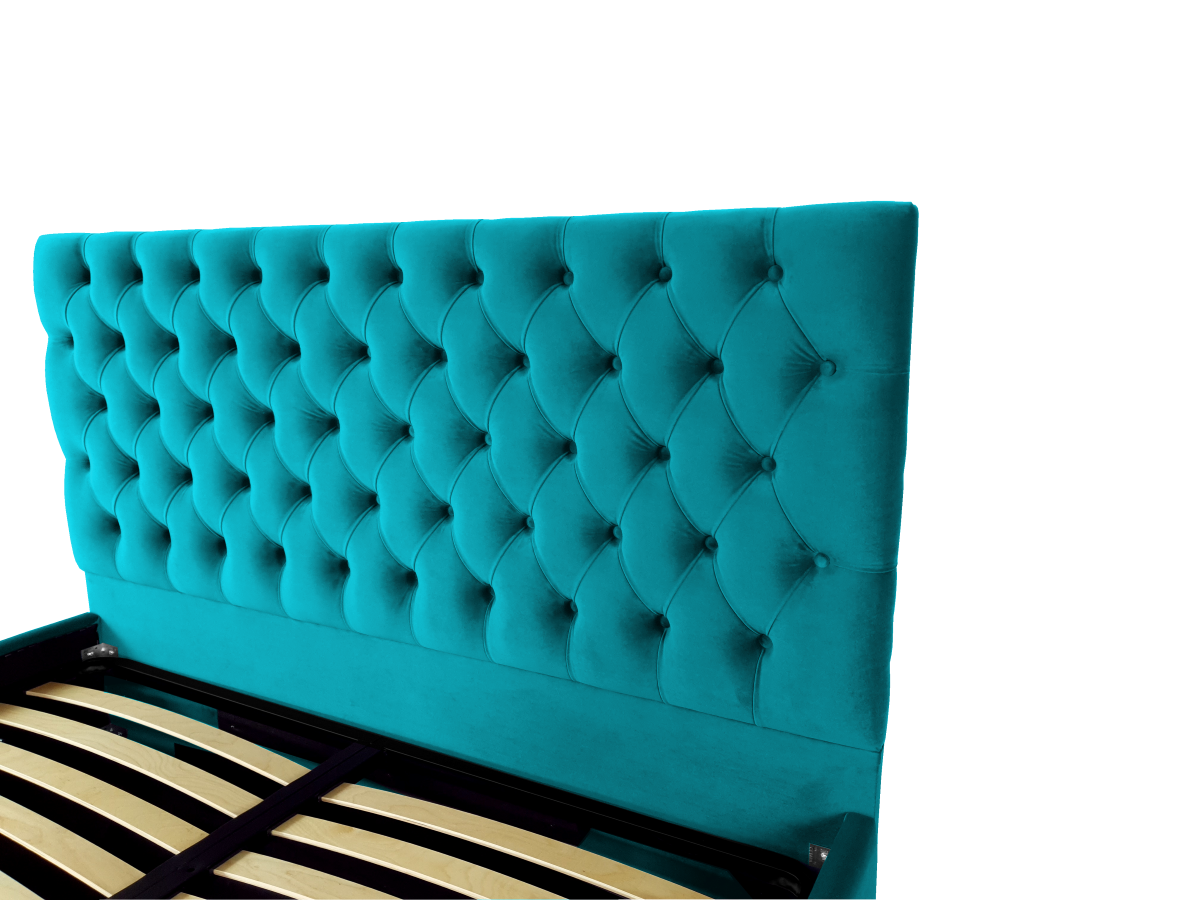 Pat tapitat Kirra -Produs in Romania. Veti fi captivat de aspectul sau unic și elegant. Rama patului este acoperita cu o tesatura moale catifelata. Un model de pat in stilul Chesterfield, tapitat in catifele moi si culori vibrante, perfect pentru un dormitor elegant. Ideal pentru saltele de 180x200 cm (saltea neinclusa). Este livrat cu somiera rabatabila cu spatiu pentru depozitare sub saltea.Se poate executa si pe alte culori.