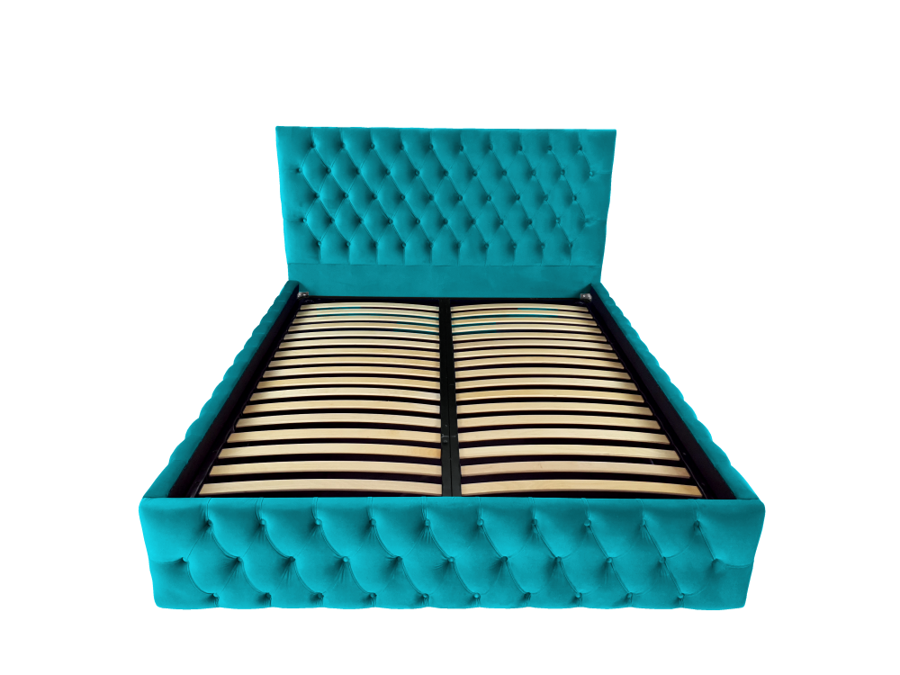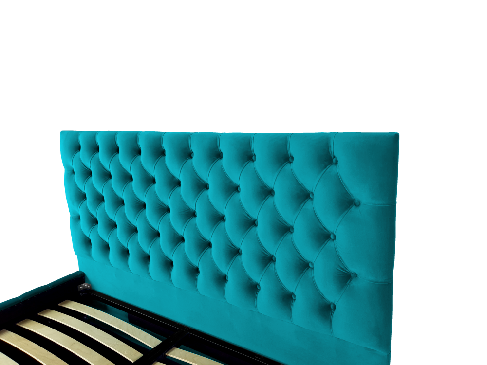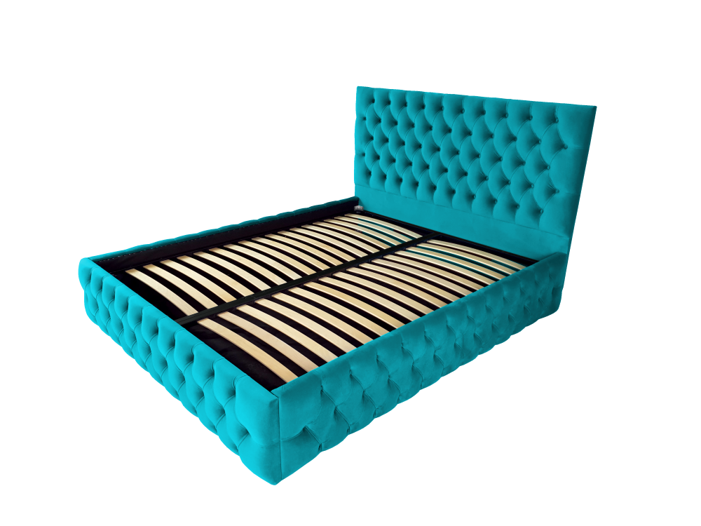 Veti fi captivat de aspectul sau unic și elegant. Rama patului este acoperita cu o tesatura moale catifelata. Un model de pat in stilul Chesterfield, tapitat in catifele moi si culori vibrante, perfect pentru un dormitor elegant. Ideal pentru saltele de 120x200 cm (saltea neinclusa). Este livrat cu somiera rabatabila cu spatiu pentru depozitare sub saltea.