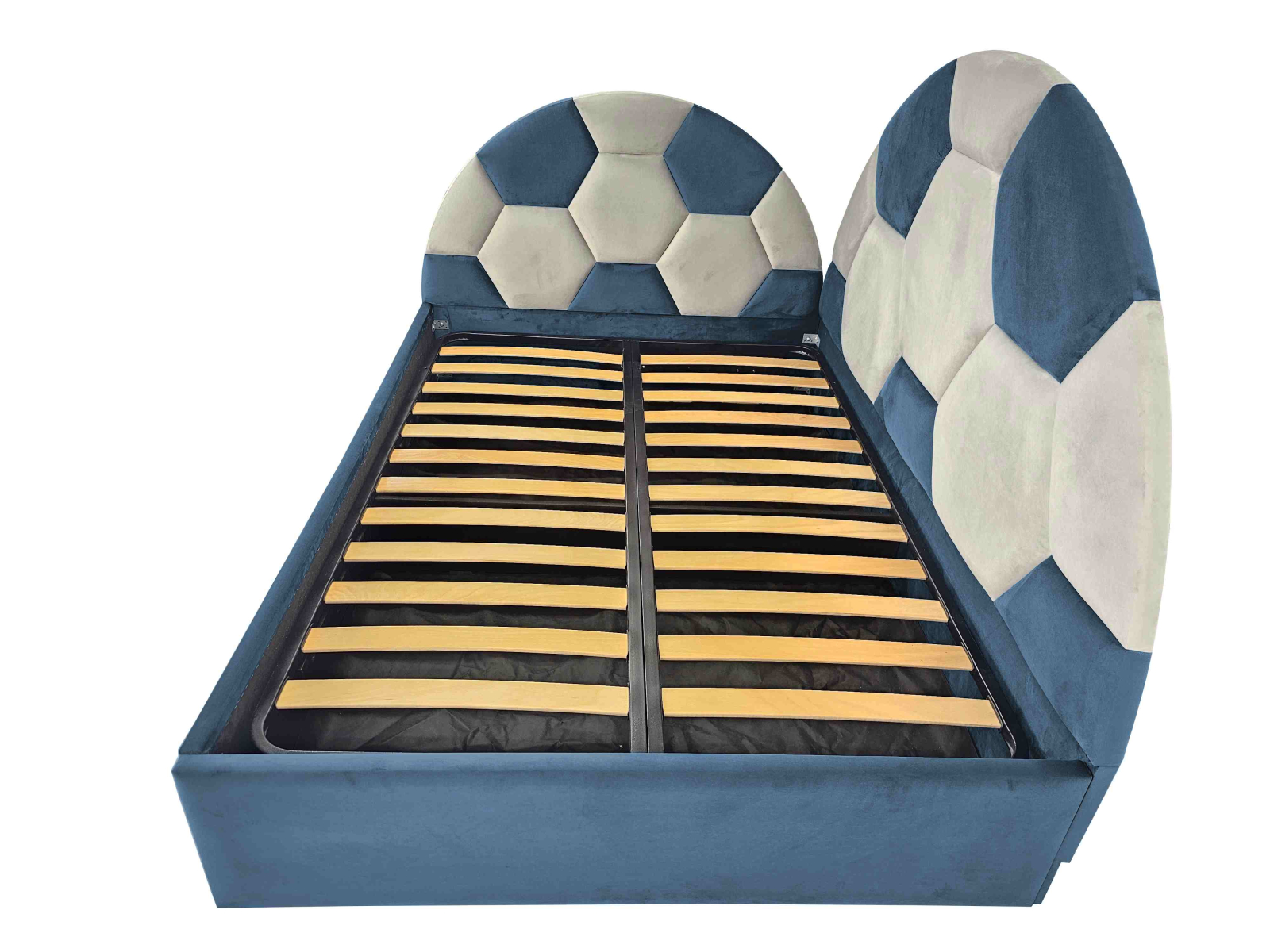 Pat tapițat Soccer modern cu tăblie ca minge de fotbal, ideal pentru dormitoare de copii și adolescenți. Design atractiv, tapițerie confortabilă și somieră cu lamele din fag inclusă. O alegere practică și stilată pentru orice cameră.